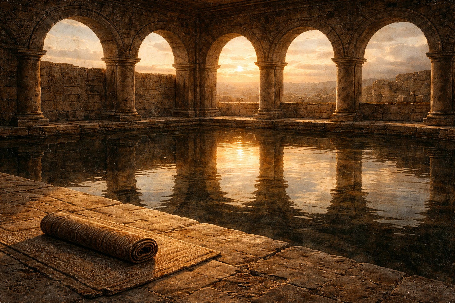 The five porticoes themselves have attracted significant theological commentary. Some patristic writers, including Cyril of Alexandria, read the five porticoes as representing the five books of the Torah, the law that could shelter and surround suffering humanity but could not heal it. The healing comes not from within the structure but from outside it. During this time, the pool was associated with periodic stirring of the water, believed to have healing properties at those moments. This reflects a widespread ancient belief in the healing power of certain springs and pools. The competitive scramble to enter the water first reflects a system entirely dependent on physical proximity, speed, and having someone to help. It is a system that structurally excludes the most vulnerable.